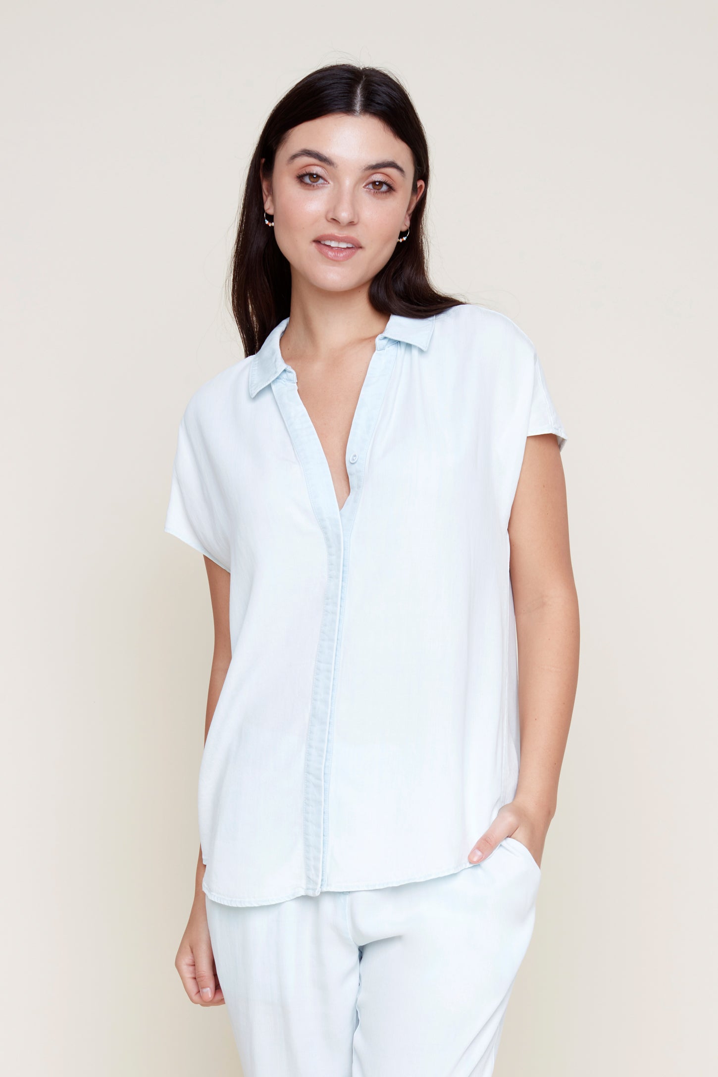 New bleached washed colored blouse. Wear to any function alone or layered with jean jacket, blazer, sweater. You will love the color!
